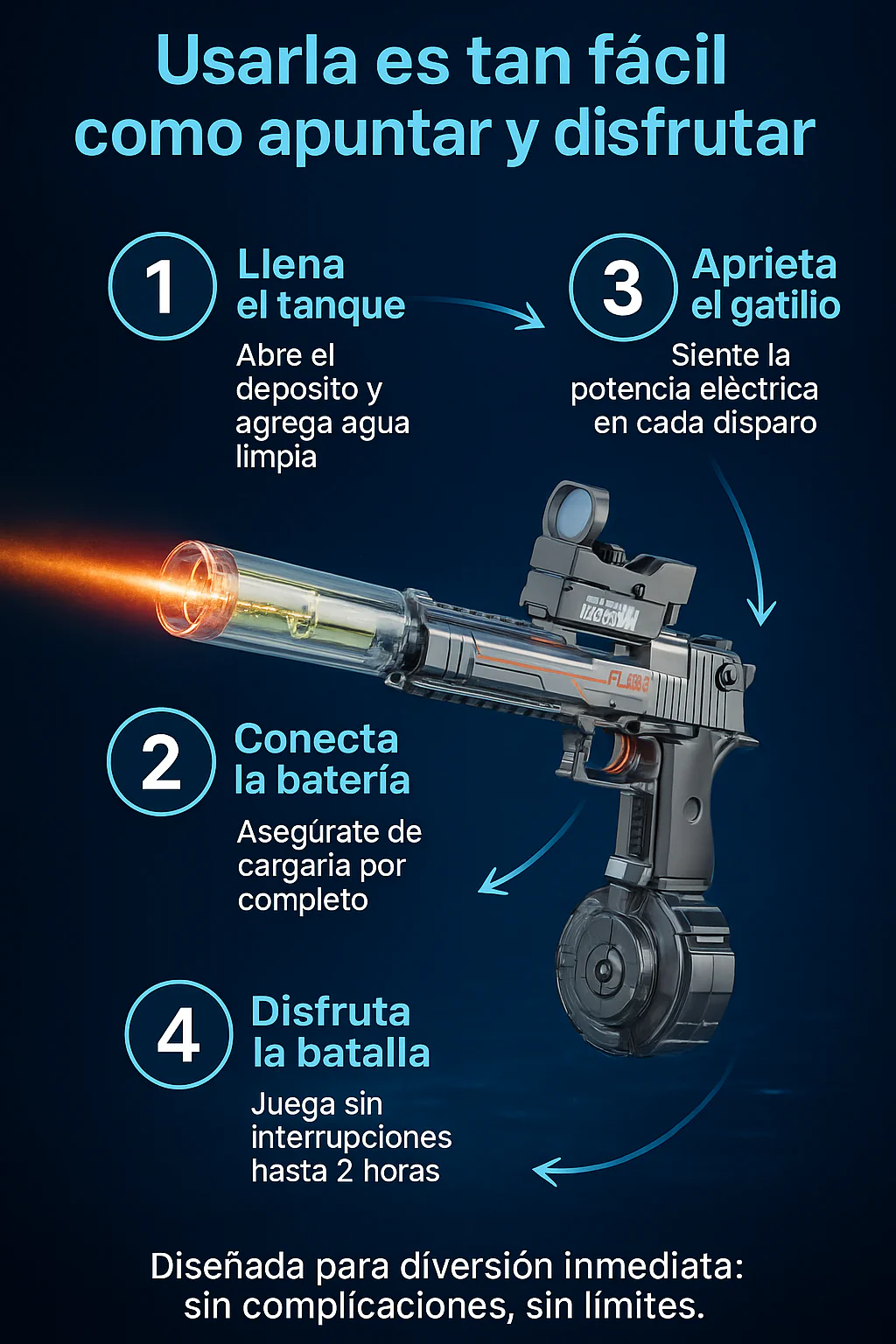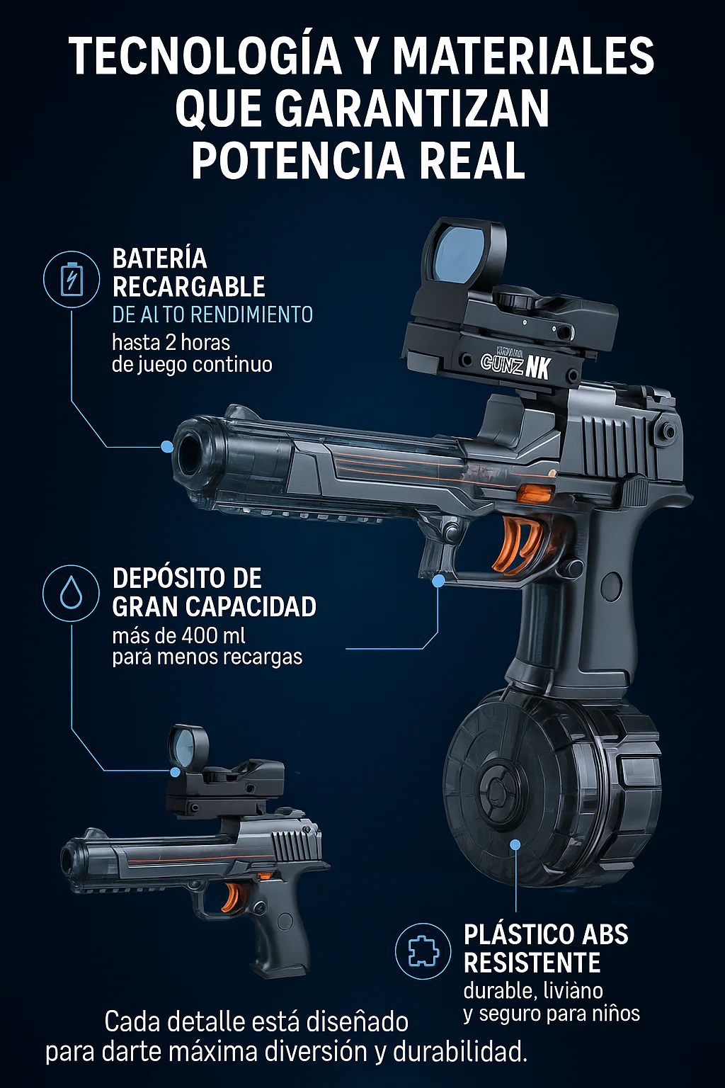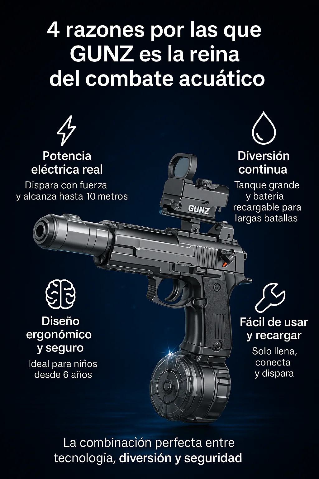 Diseñada para ofrecer disparos continuos, gran capacidad y un estilo moderno que encanta a niños, jóvenes y adultos.
